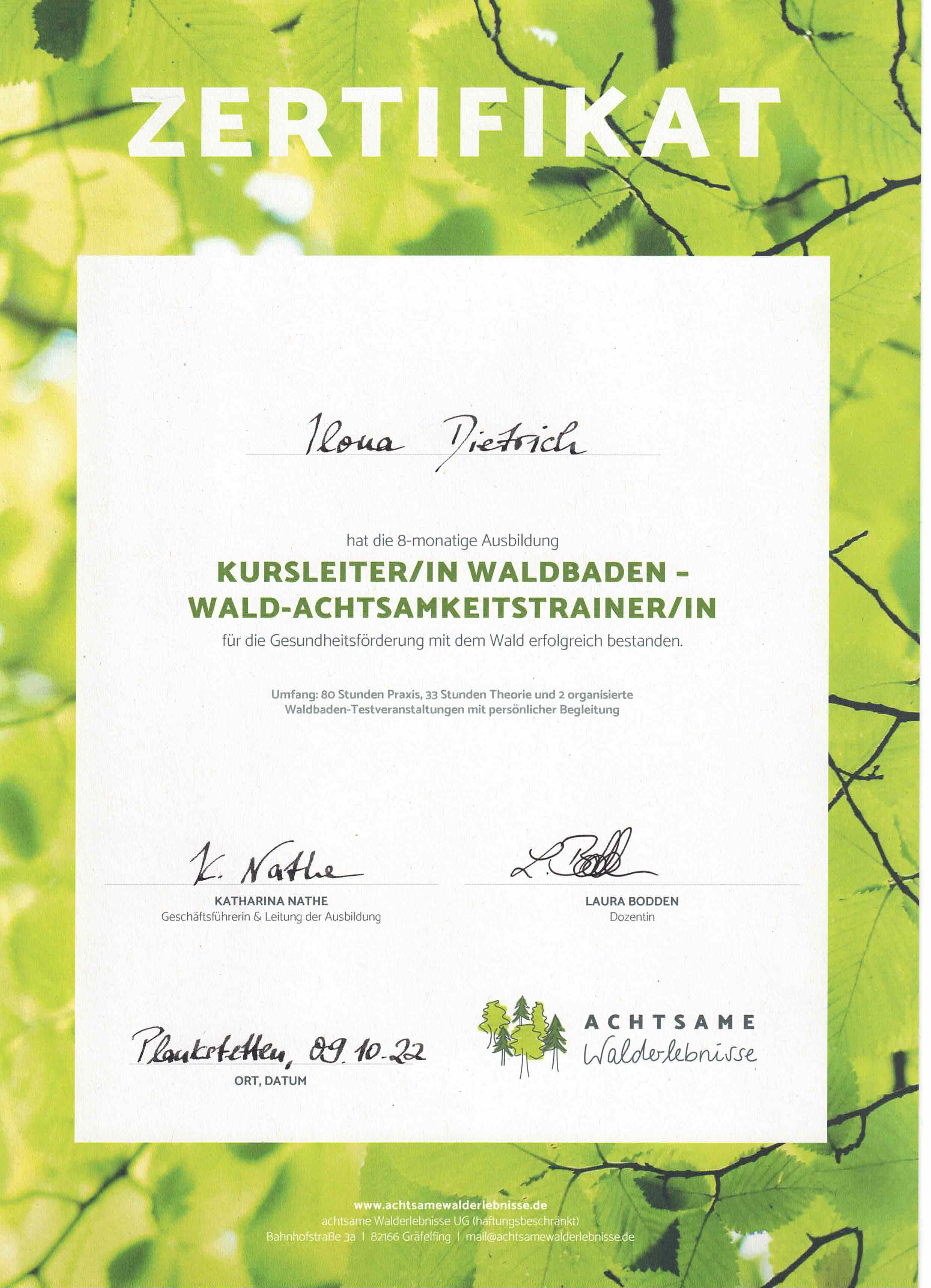 2022 die Ausbildung zur Waldachtsamkeitstrainerin abgeschlossen.Wir können eine jahrelange Erfahrung in